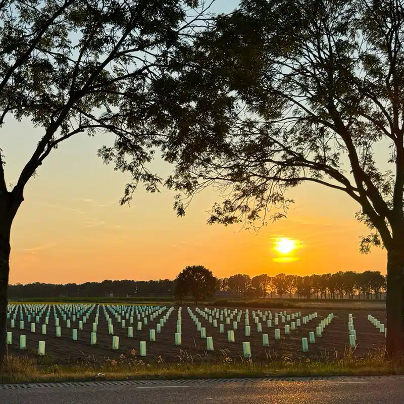 Onze productie is geworteld in de natuur. Rond onze showroom groeit 2.2 hectare Paulownia-bos. Een snelgroeiend, CO₂-negatief houtsoort die meer CO₂ opneemt dan ze uitstoot. Dit bos compenseert onze volledige productie en vormt de levende kern van onze missie: design creëren dat de aarde verrijkt in plaats van uitput.