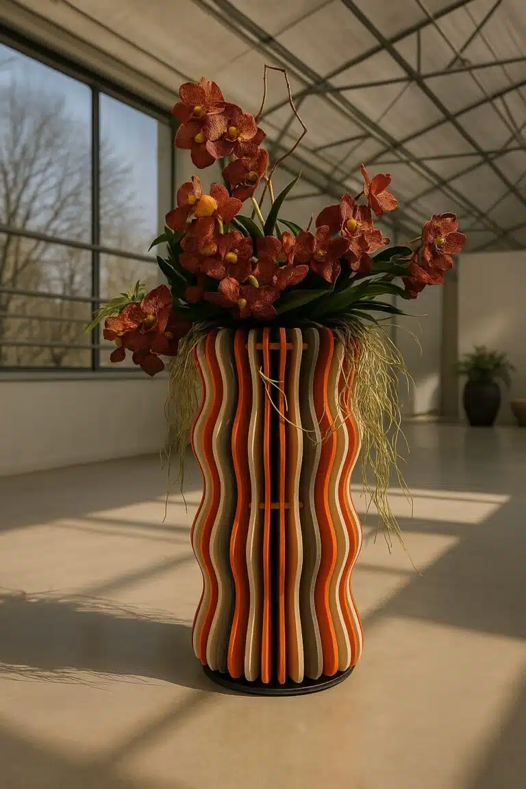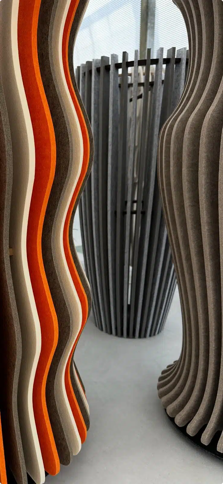 Oggi creëert circulaire designobjecten gemaakt van gerecycled en lokaal materiaal, ontwikkeld om ruimtes te verbeteren in vorm, geluid en beleving. Elk product wordt CO₂-neutraal geproduceerd en is aanpasbaar in materiaal, formaat en functie, zodat het perfect aansluit bij jouw architectonische visie.